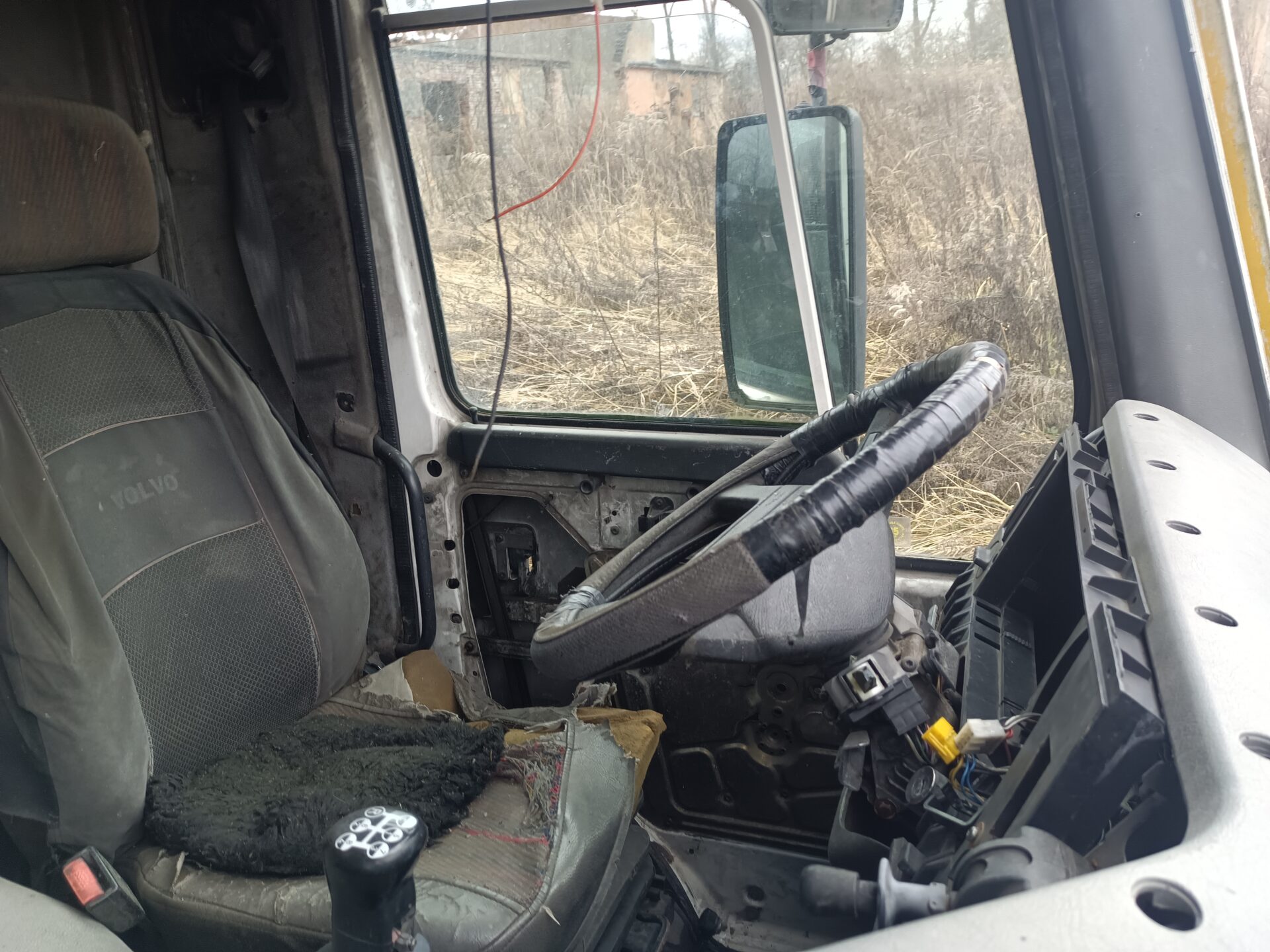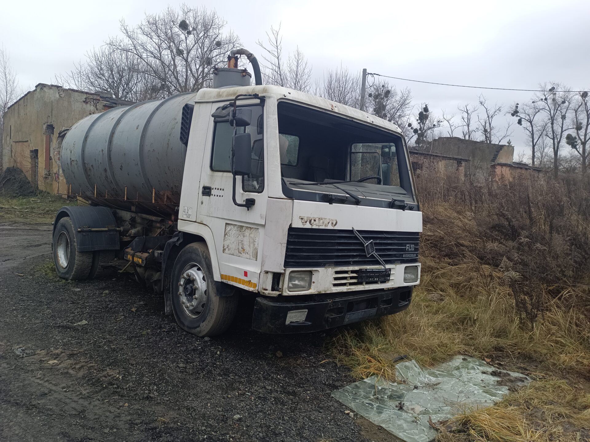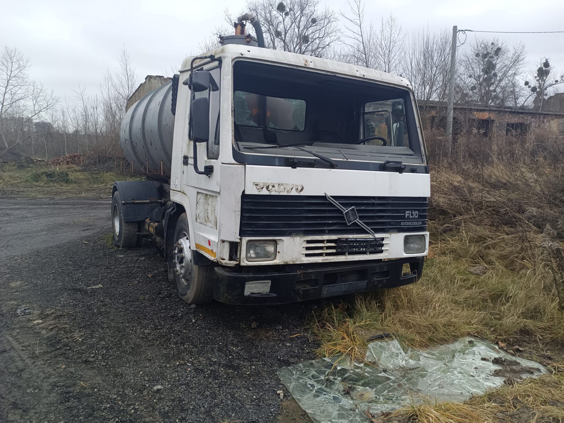 Nas jednak przy tej eksploracji najbardziej interesowały dwa opuszczone samochody. Jednym z nich było ciężarowe Volvo z beczką. Wygląda jak szambo wóz. Samochód ma ściągnięte tablice rejestracyjne, jednak po naklejce na szybie widać że był zarejestrowany w Polsce. Przednia szyba została dosłownie wyrwana z samochodu i leży przed jego przodem. Tylna szyba jest rozbita, a wnętrze samochodu splądrowane. Zegarów już brakuje, boczki drzwi zniszczone, a klamki powyrywane.