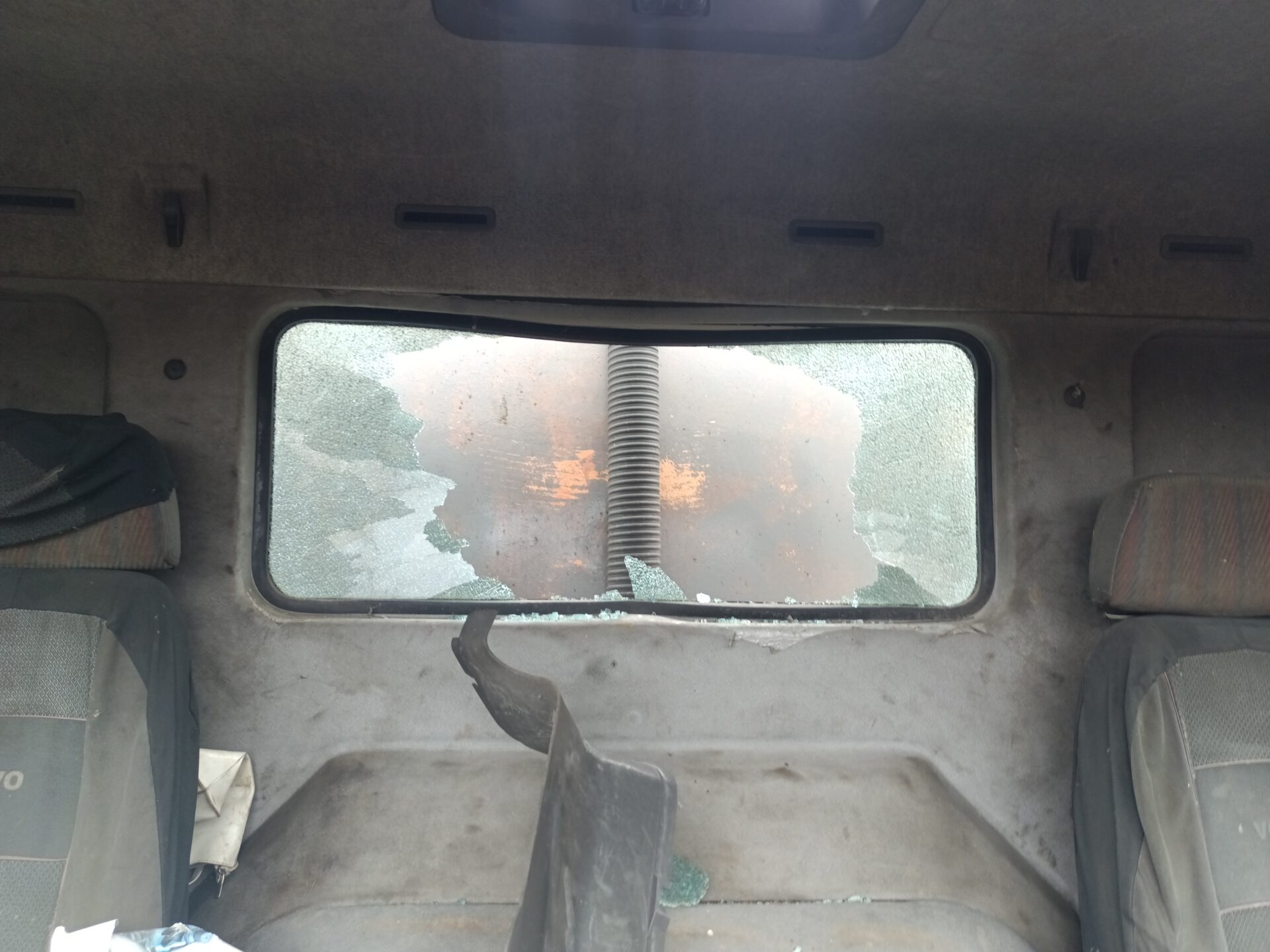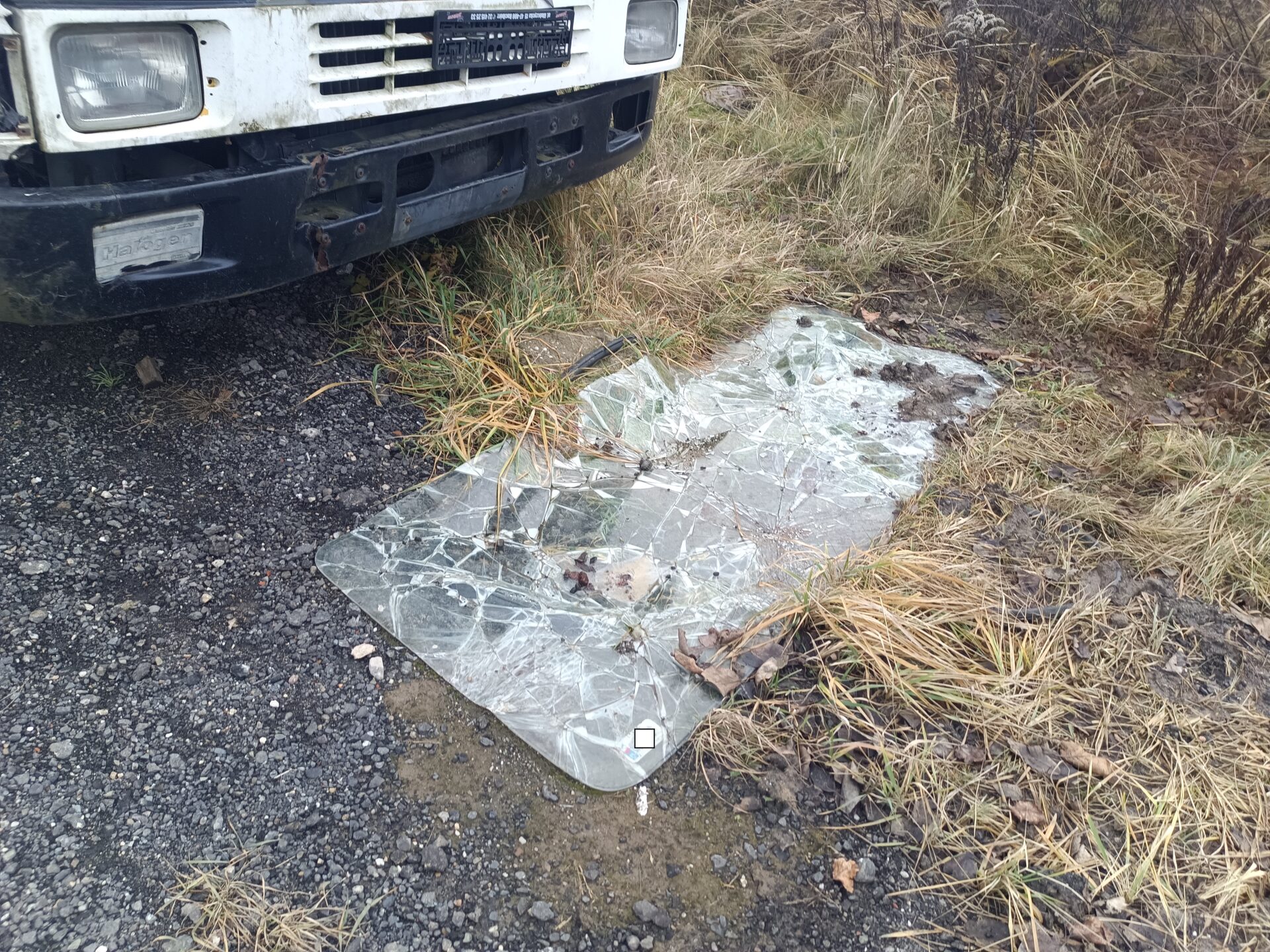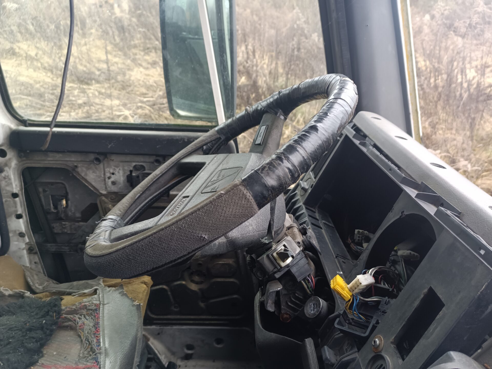 Nas jednak przy tej eksploracji najbardziej interesowały dwa opuszczone samochody. Jednym z nich było ciężarowe Volvo z beczką. Wygląda jak szambo wóz. Samochód ma ściągnięte tablice rejestracyjne, jednak po naklejce na szybie widać że był zarejestrowany w Polsce. Przednia szyba została dosłownie wyrwana z samochodu i leży przed jego przodem. Tylna szyba jest rozbita, a wnętrze samochodu splądrowane. Zegarów już brakuje, boczki drzwi zniszczone, a klamki powyrywane.