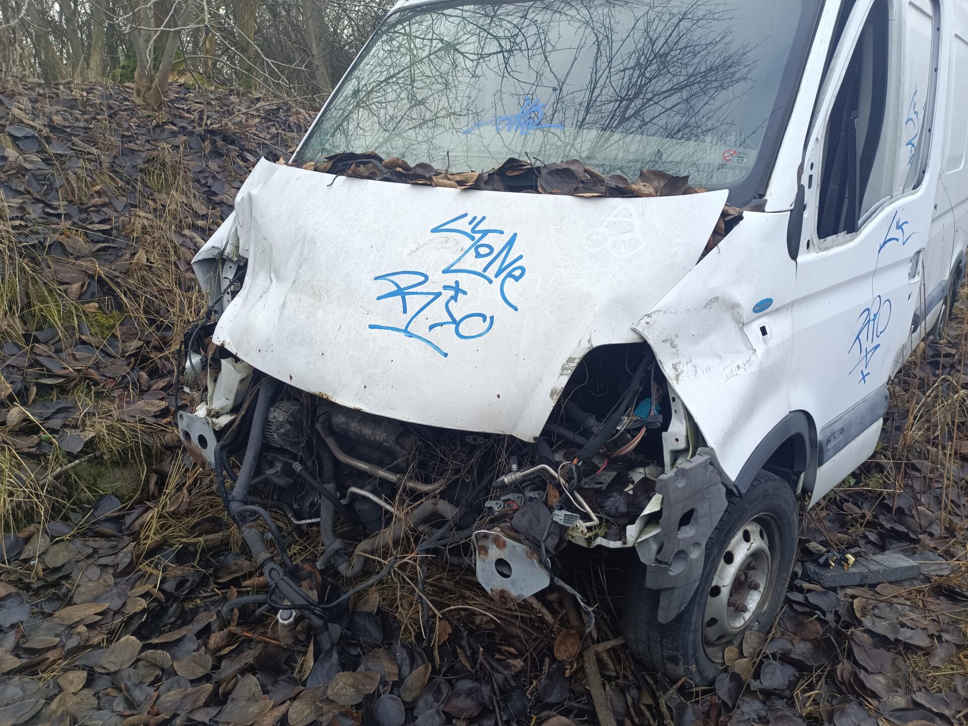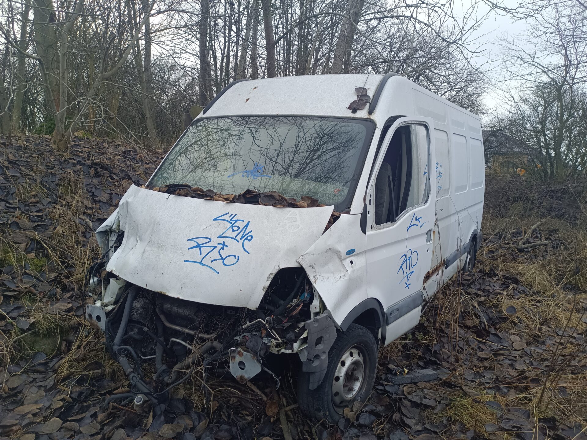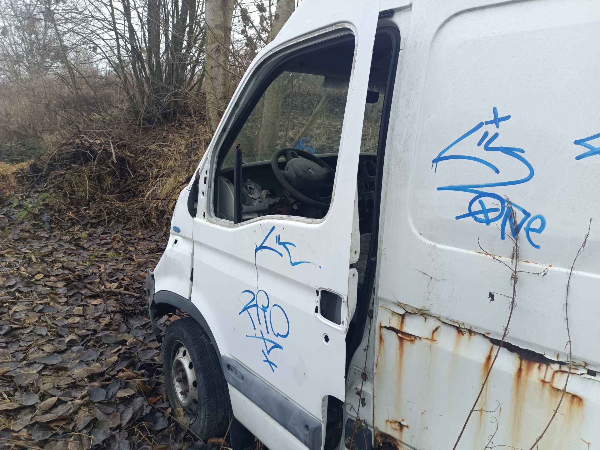 Ale ciężarowe opuszczone Volvo to nie jedyny pojazd który się tutaj znajduje. Idąc dalej znajdziemy opuszczony i rozbity samochód dostawczy jakim jest Renault Master. Co ciekawe na pace Renanult znajdziemy łódkę. Renault jednak zostało mocno już rozkradzione. We wnętrzu nie znajdziemy już prawie nic. Cały kokpit został rozebrany. Przełączniki powyrywane, szyby rozbite. Samochód już nie nadaje się do niczego poza zezłomowaniem.