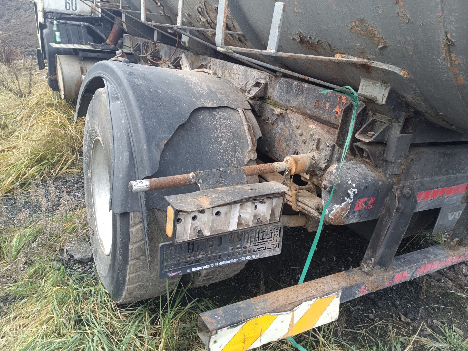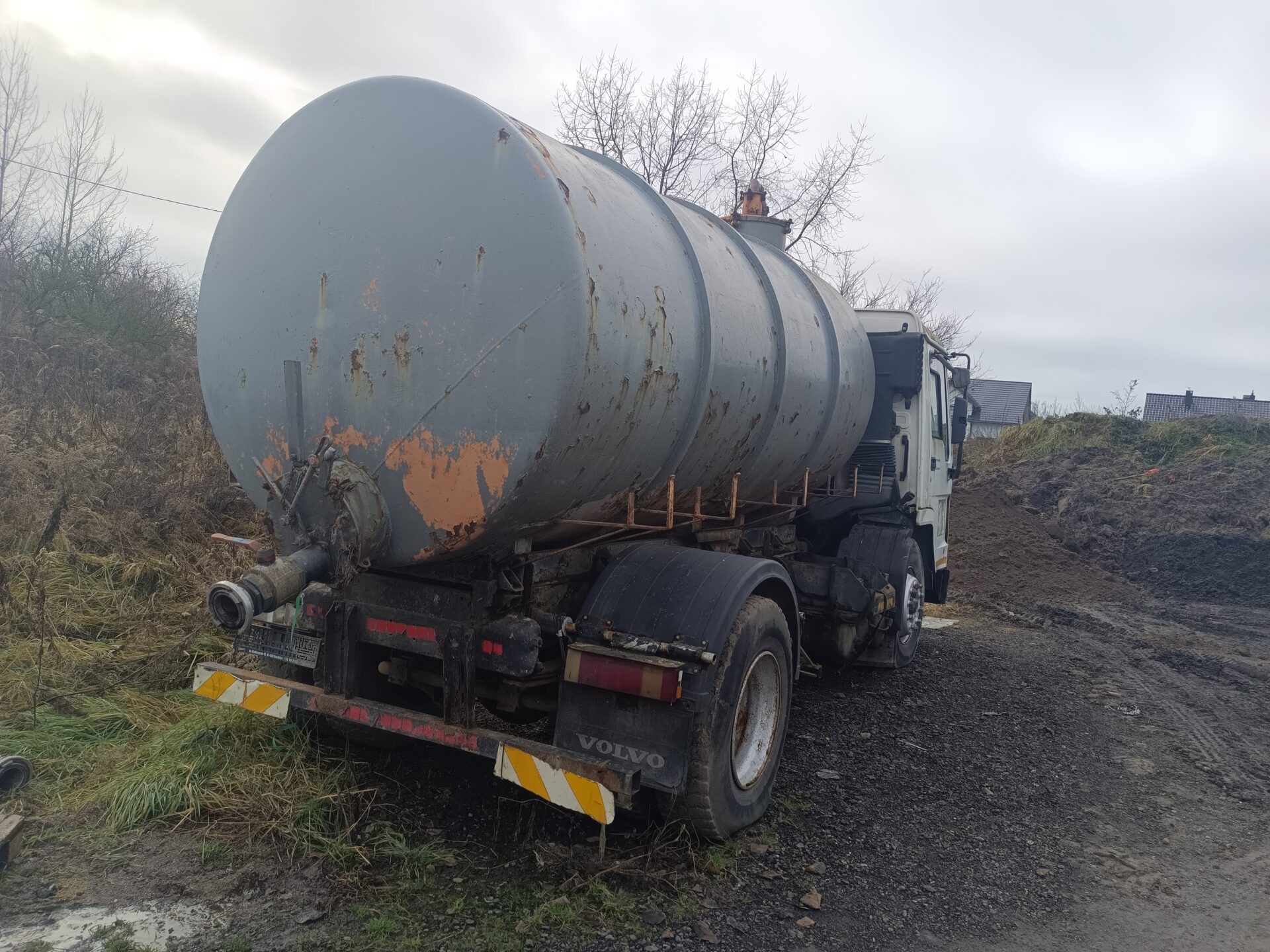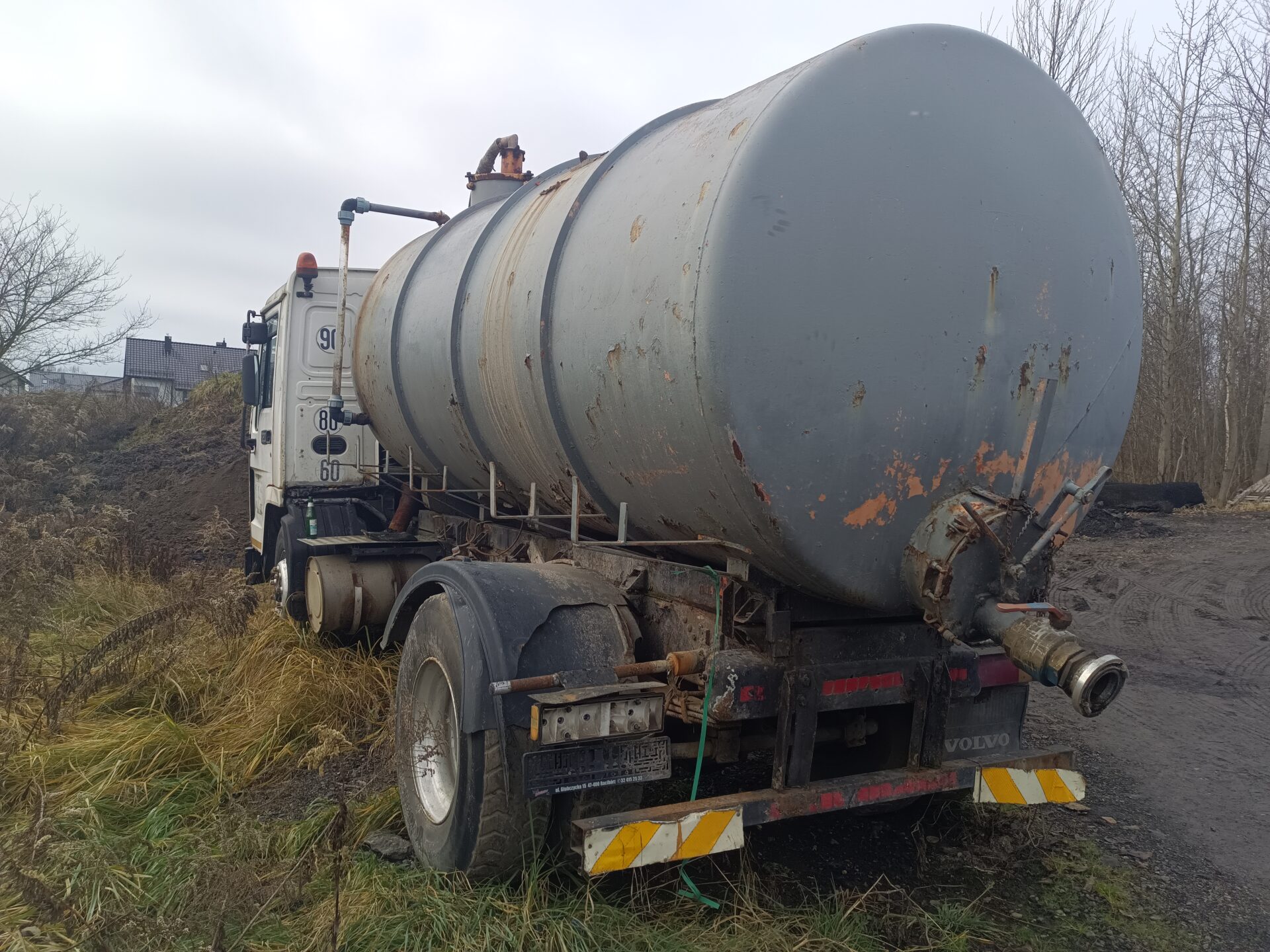 Nas jednak przy tej eksploracji najbardziej interesowały dwa opuszczone samochody. Jednym z nich było ciężarowe Volvo z beczką. Wygląda jak szambo wóz. Samochód ma ściągnięte tablice rejestracyjne, jednak po naklejce na szybie widać że był zarejestrowany w Polsce. Przednia szyba została dosłownie wyrwana z samochodu i leży przed jego przodem. Tylna szyba jest rozbita, a wnętrze samochodu splądrowane. Zegarów już brakuje, boczki drzwi zniszczone, a klamki powyrywane.