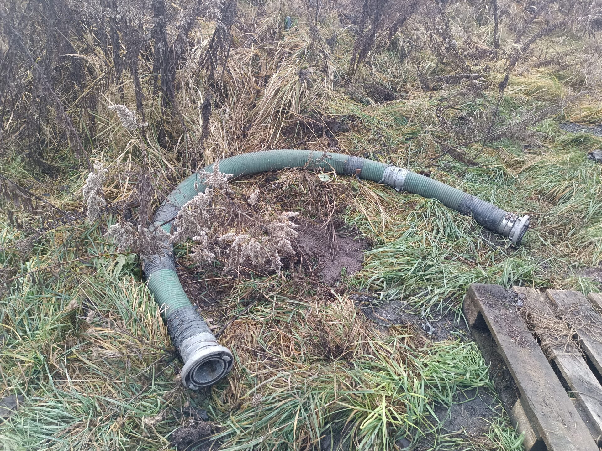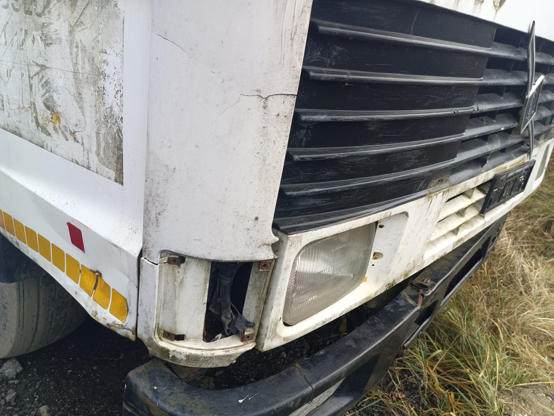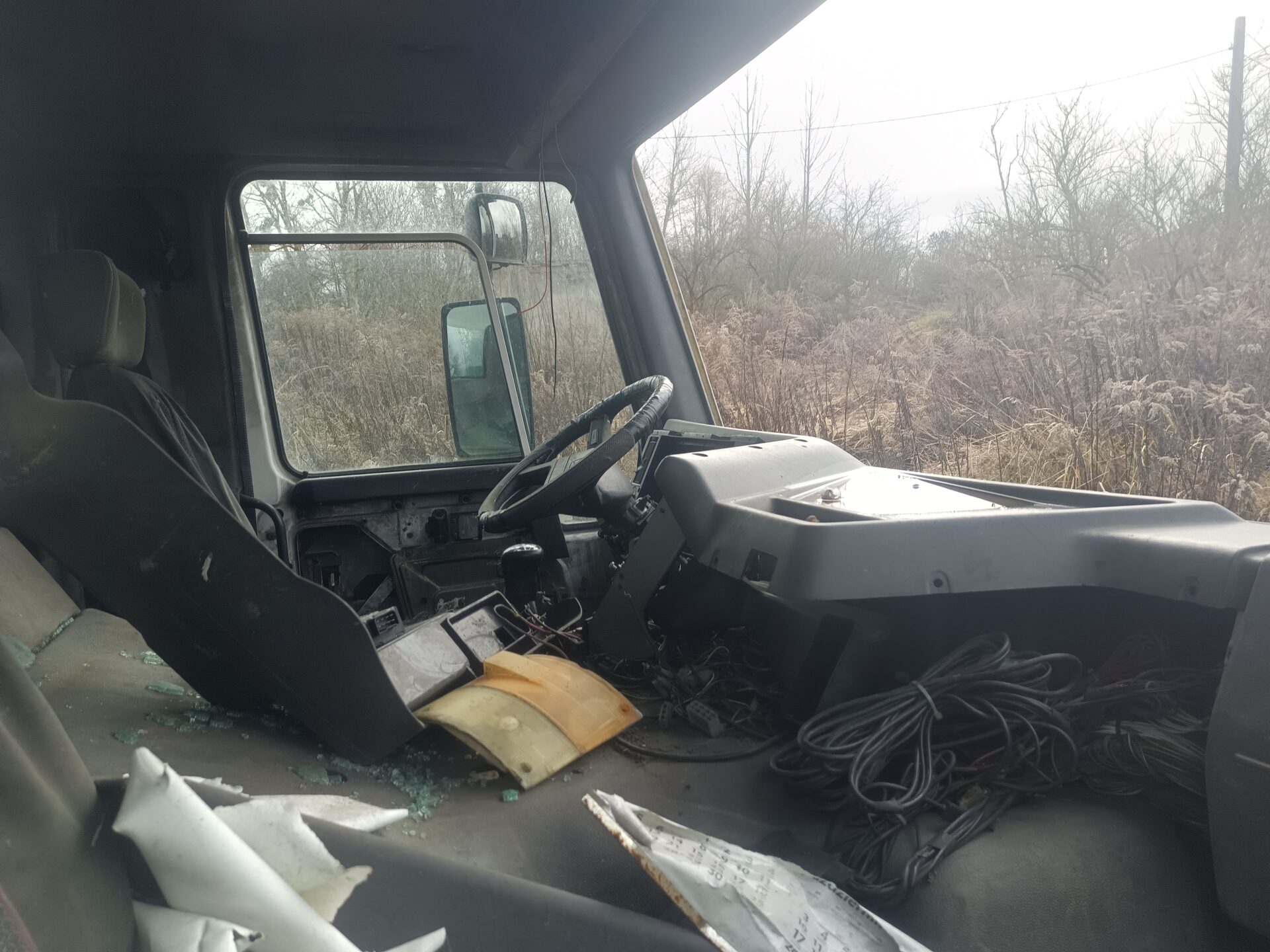 Nas jednak przy tej eksploracji najbardziej interesowały dwa opuszczone samochody. Jednym z nich było ciężarowe Volvo z beczką. Wygląda jak szambo wóz. Samochód ma ściągnięte tablice rejestracyjne, jednak po naklejce na szybie widać że był zarejestrowany w Polsce. Przednia szyba została dosłownie wyrwana z samochodu i leży przed jego przodem. Tylna szyba jest rozbita, a wnętrze samochodu splądrowane. Zegarów już brakuje, boczki drzwi zniszczone, a klamki powyrywane.