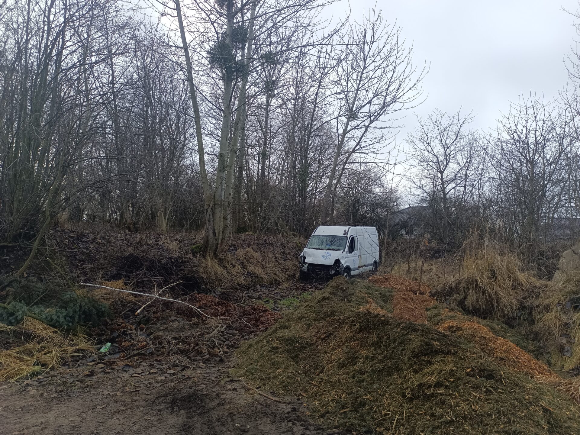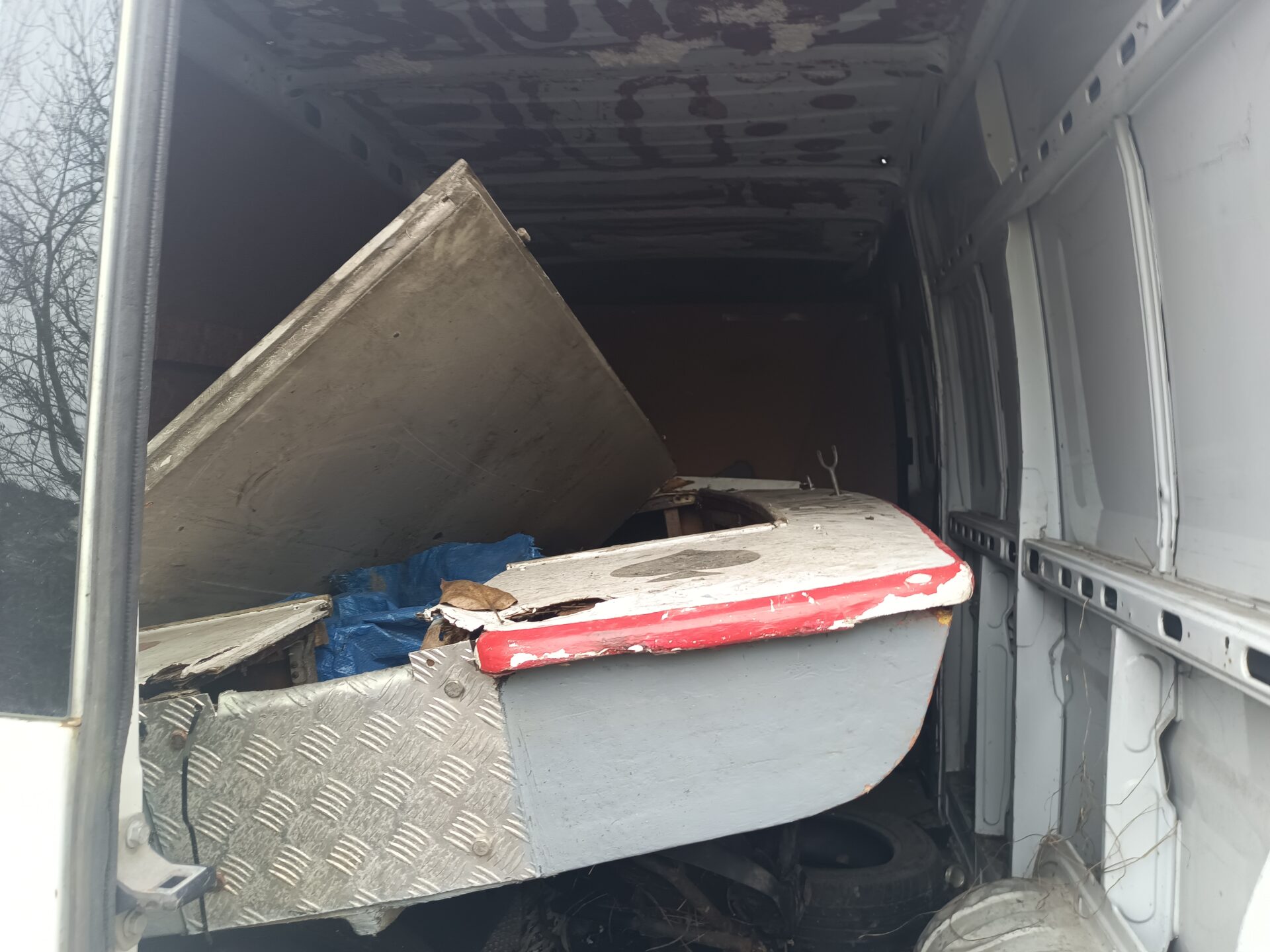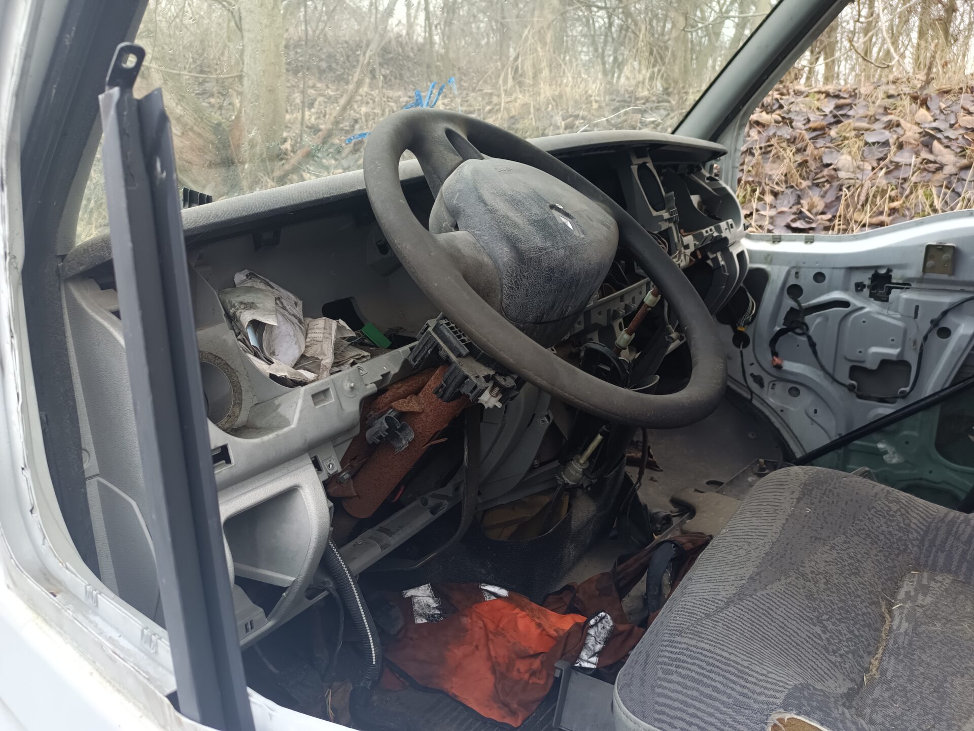 Ale ciężarowe opuszczone Volvo to nie jedyny pojazd który się tutaj znajduje. Idąc dalej znajdziemy opuszczony i rozbity samochód dostawczy jakim jest Renault Master. Co ciekawe na pace Renanult znajdziemy łódkę. Renault jednak zostało mocno już rozkradzione. We wnętrzu nie znajdziemy już prawie nic. Cały kokpit został rozebrany. Przełączniki powyrywane, szyby rozbite. Samochód już nie nadaje się do niczego poza zezłomowaniem.
