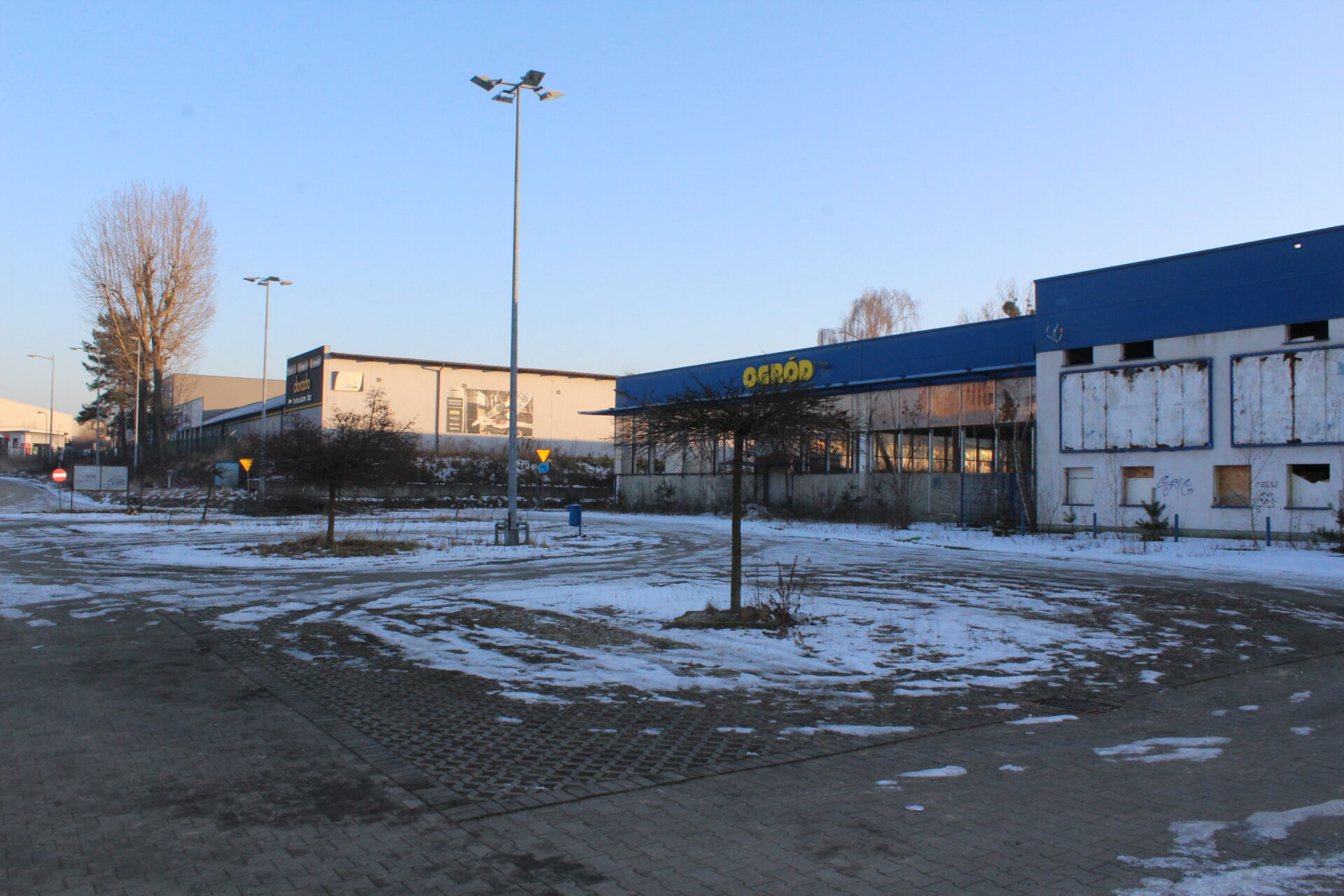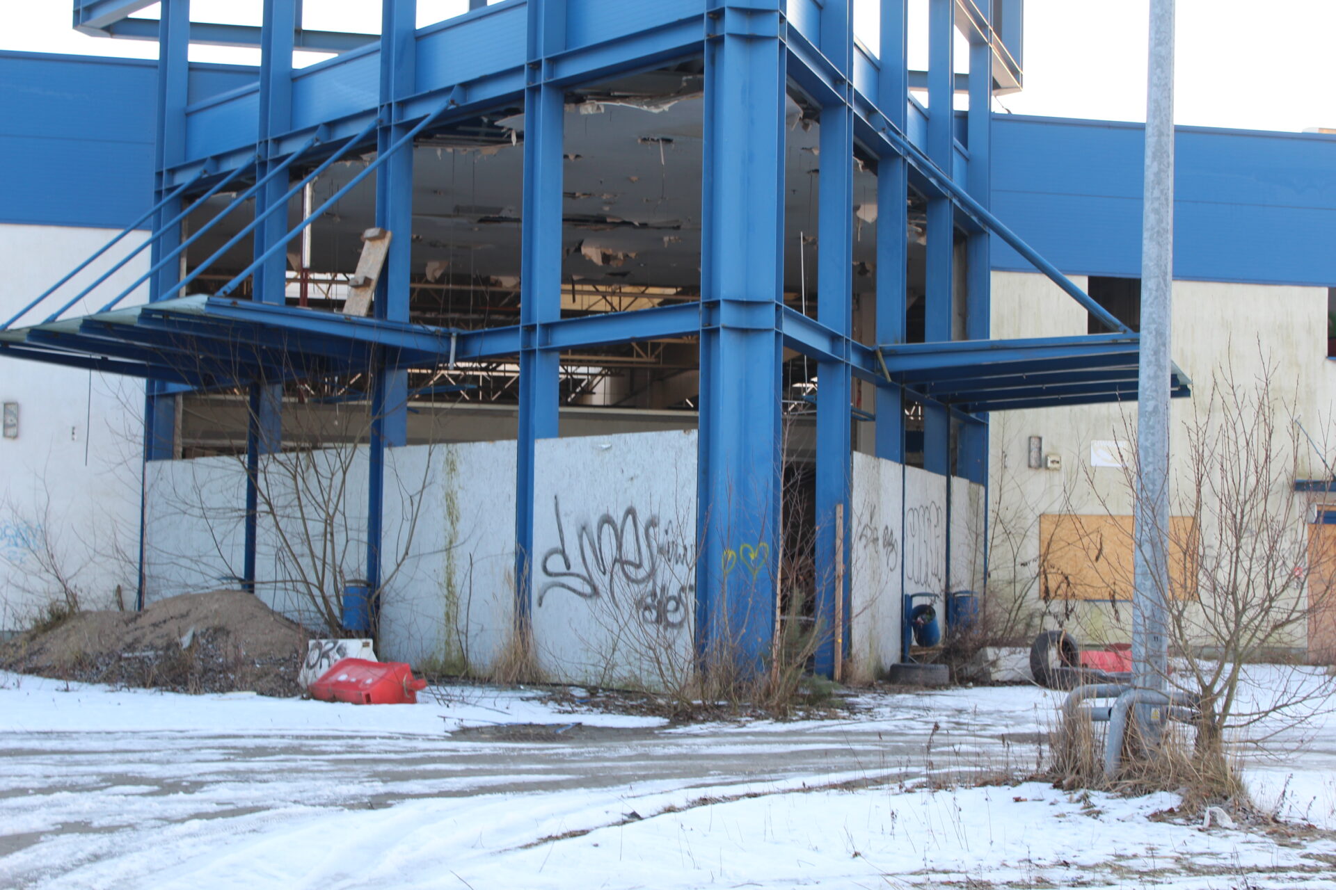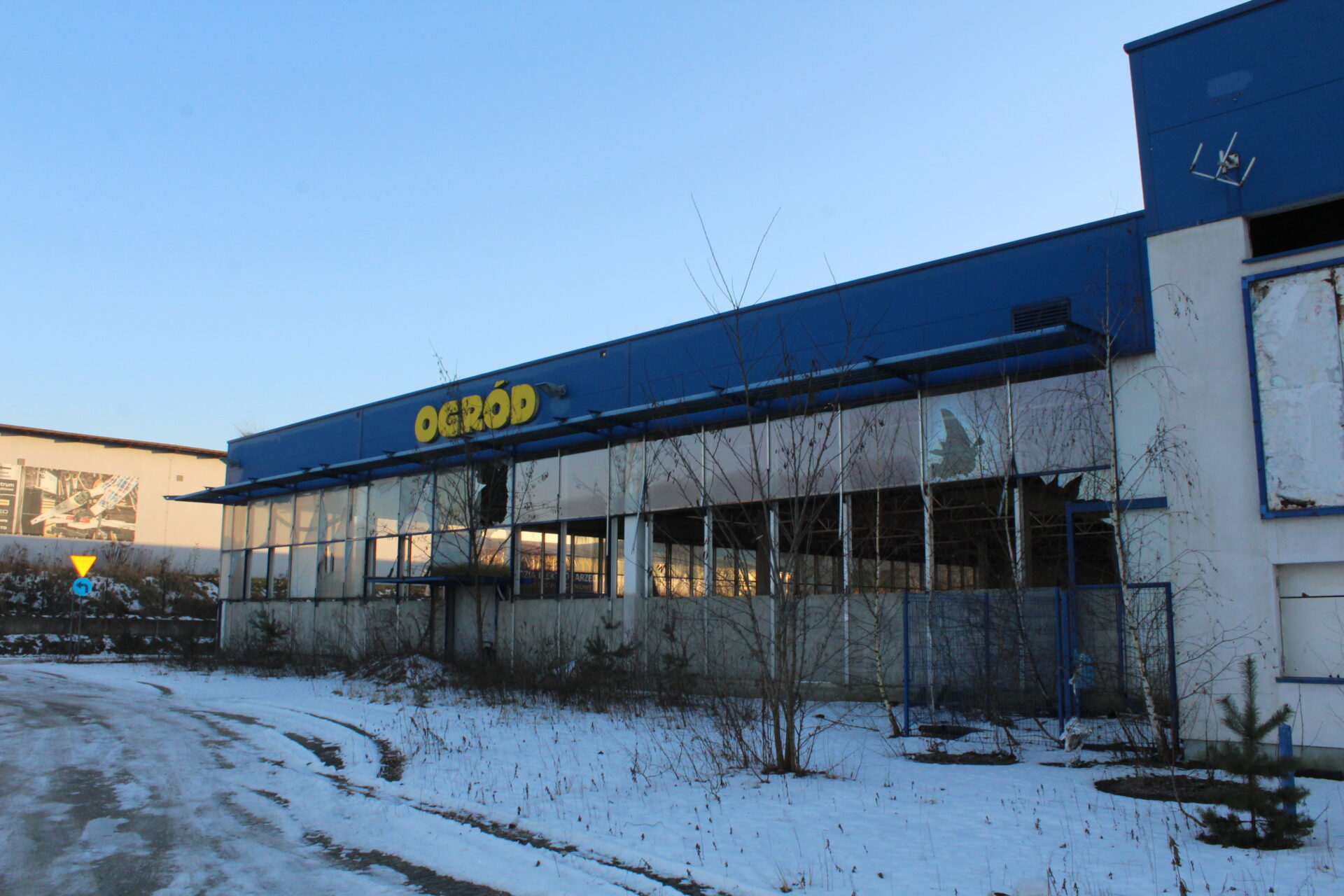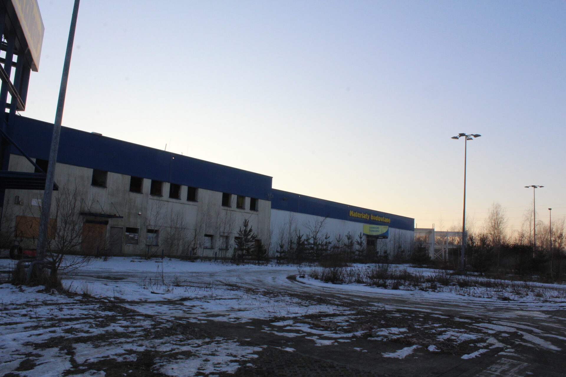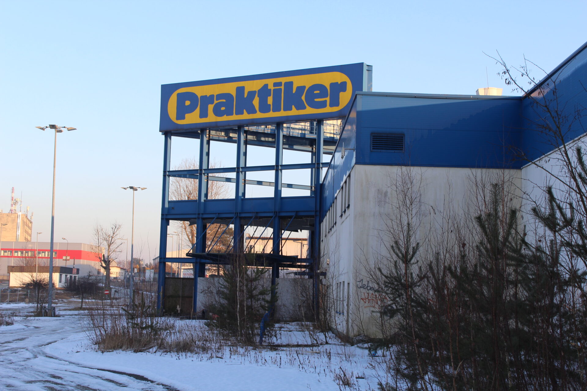 Na sklepie wisi jeszcze wielki napis PRAKTIKER i niestety tylko tyle po nim zostało… Biorąc po uwagę jego stan, tańszym i szybszym rozwiązaniem na dzień dzisiejszy było by wybudowanie nowego sklepu niż zakup tego budynku.