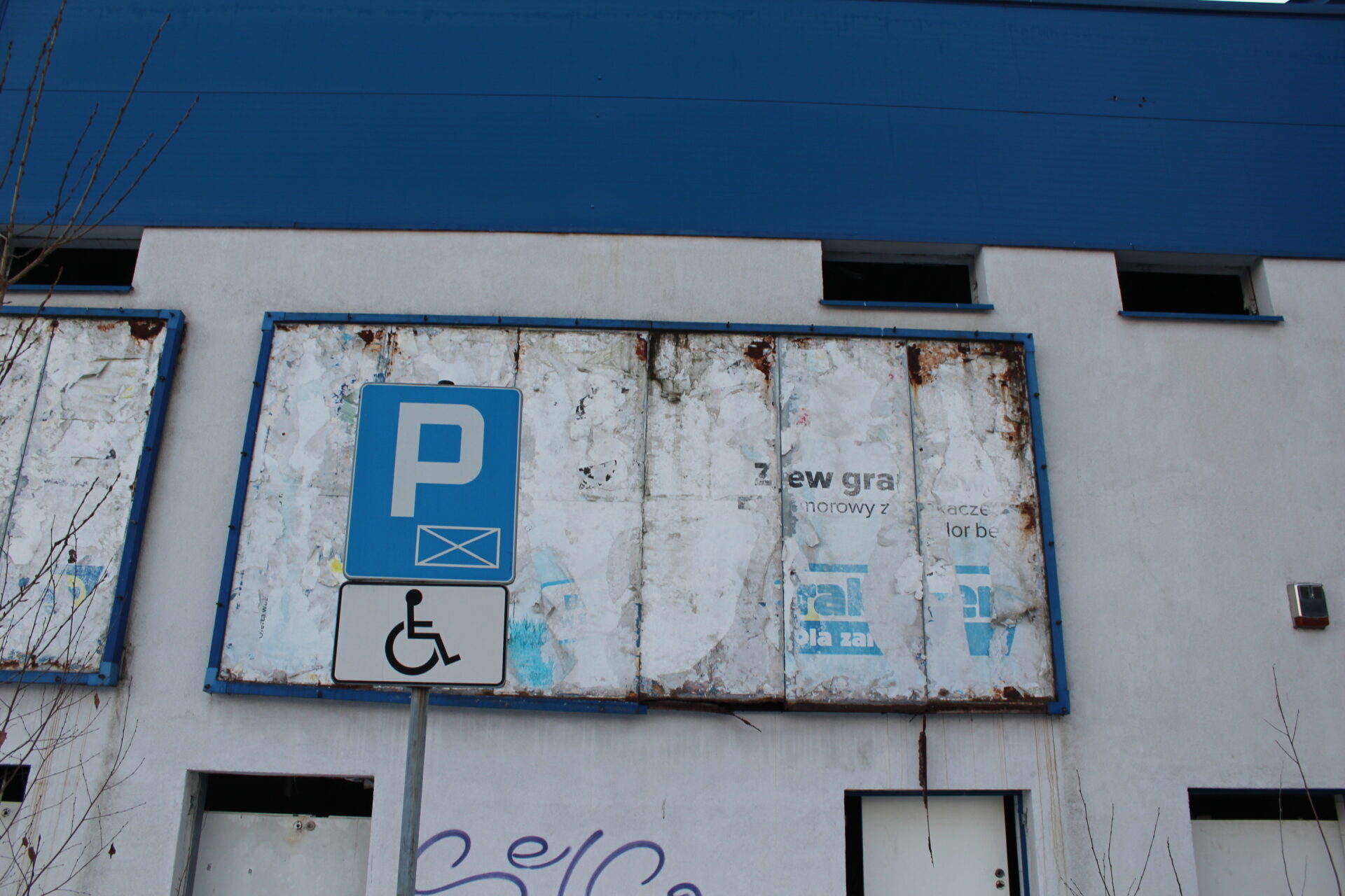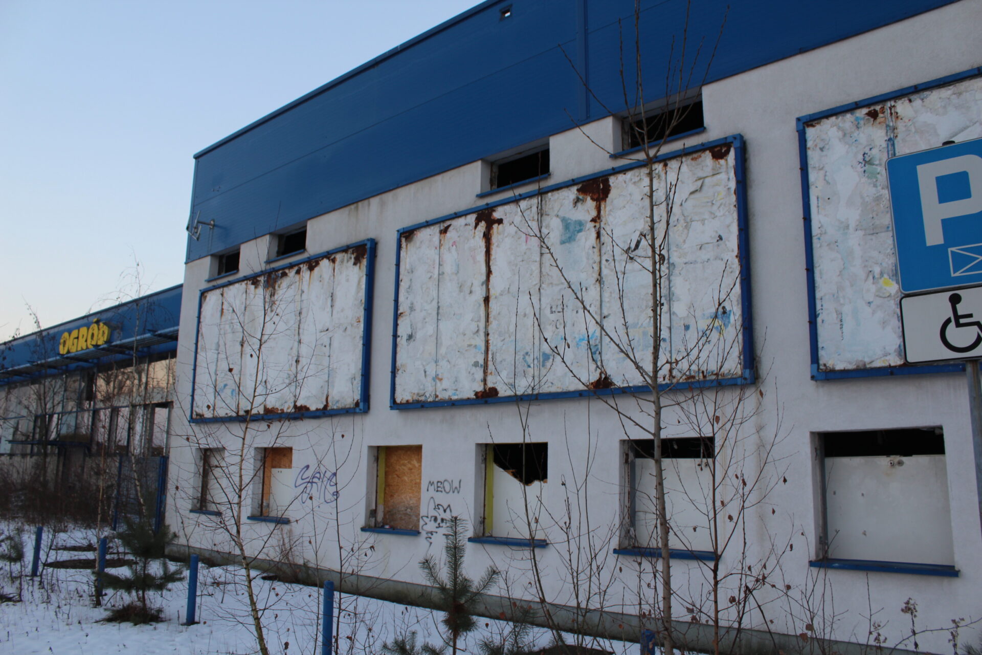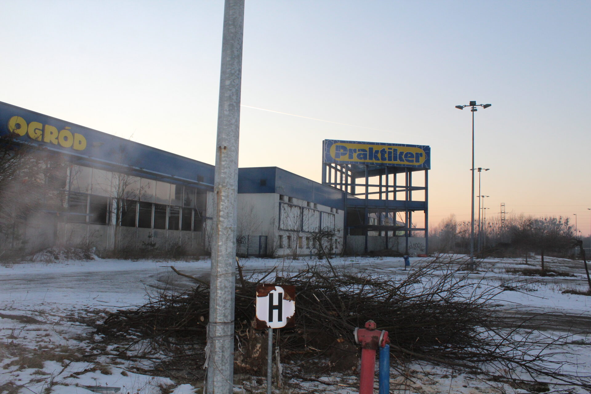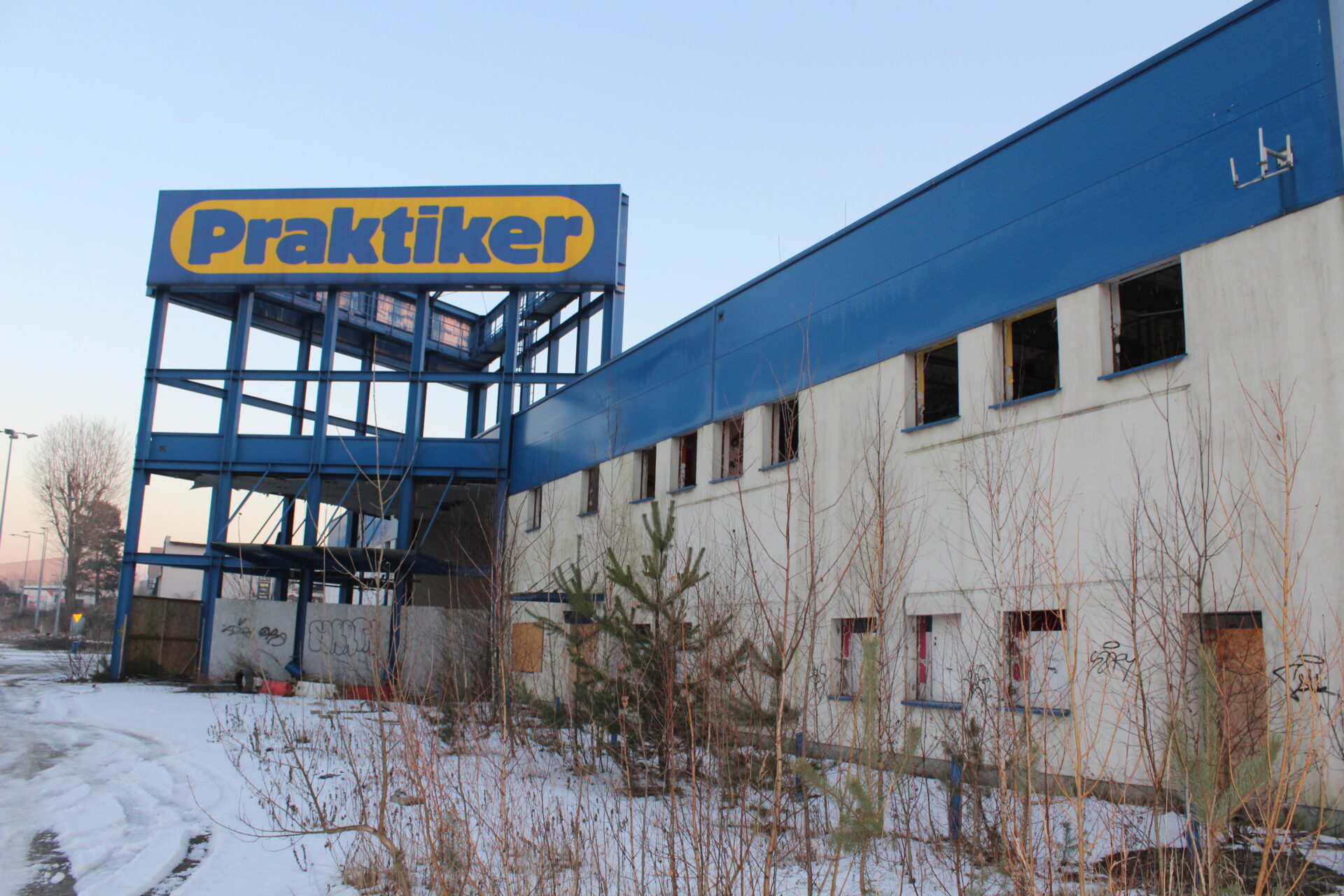 Na sklepie wisi jeszcze wielki napis PRAKTIKER i niestety tylko tyle po nim zostało… Biorąc po uwagę jego stan, tańszym i szybszym rozwiązaniem na dzień dzisiejszy było by wybudowanie nowego sklepu niż zakup tego budynku.